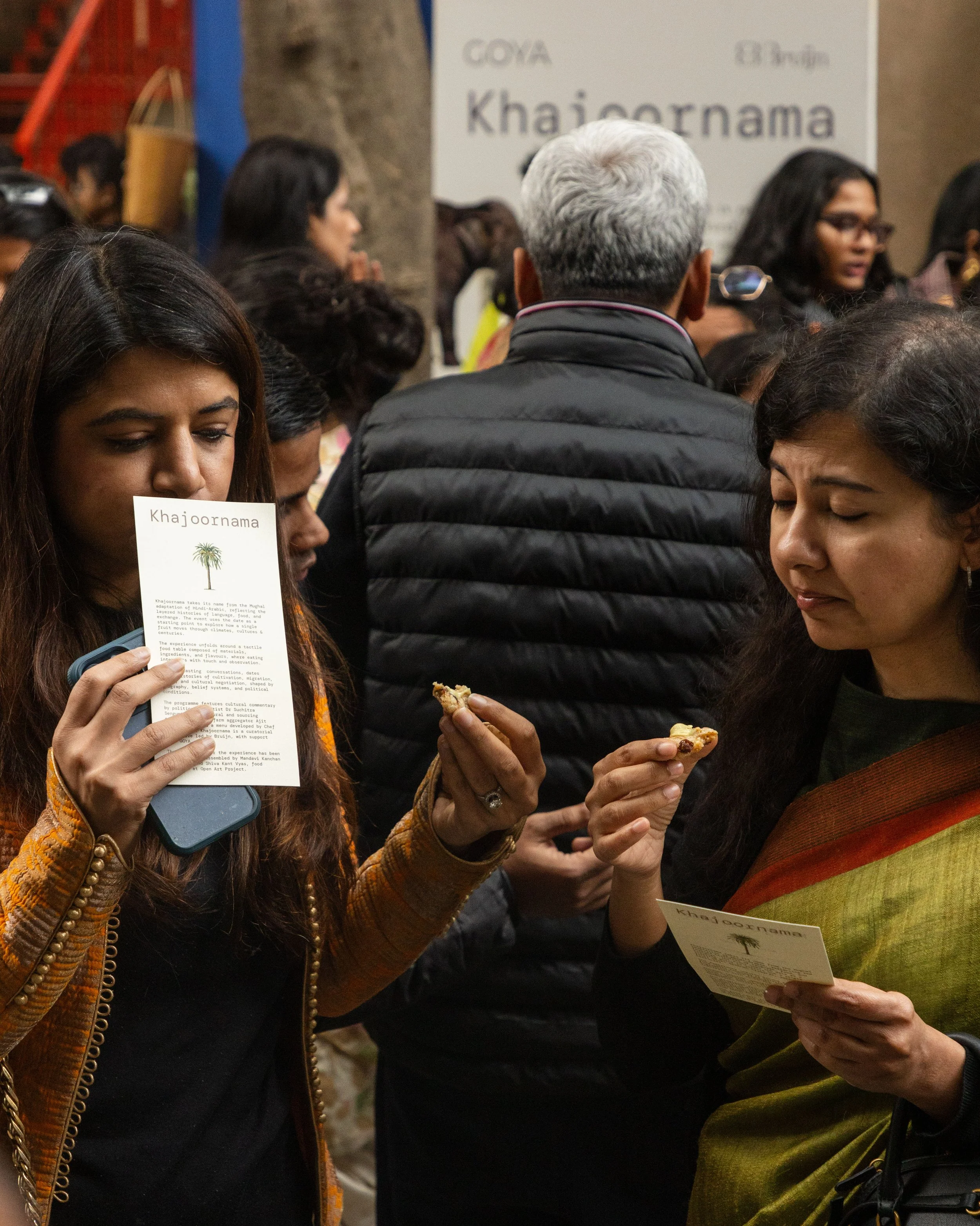GOYA hosted Khajoornama in partnership with Bruijn ,as part of the India Art Fair’s Young Collectors Programme at Triveni Kala Sangam, gathering around a shared table to trace the journey of the date across the Indian subcontinent. Entering through the Malabar coastline, the date travelled inland along trade routes, finding place in regional kitchens, ritual practices, and royal cuisines before arriving in cultivation landscapes in contemporary Rajasthan. The grazing table, designed by Chef Taiyaba Ali, featured Bandel Khajoor Chop, Kurukku Kalan, Kharak Samosa, and Walnut Date Fudge.